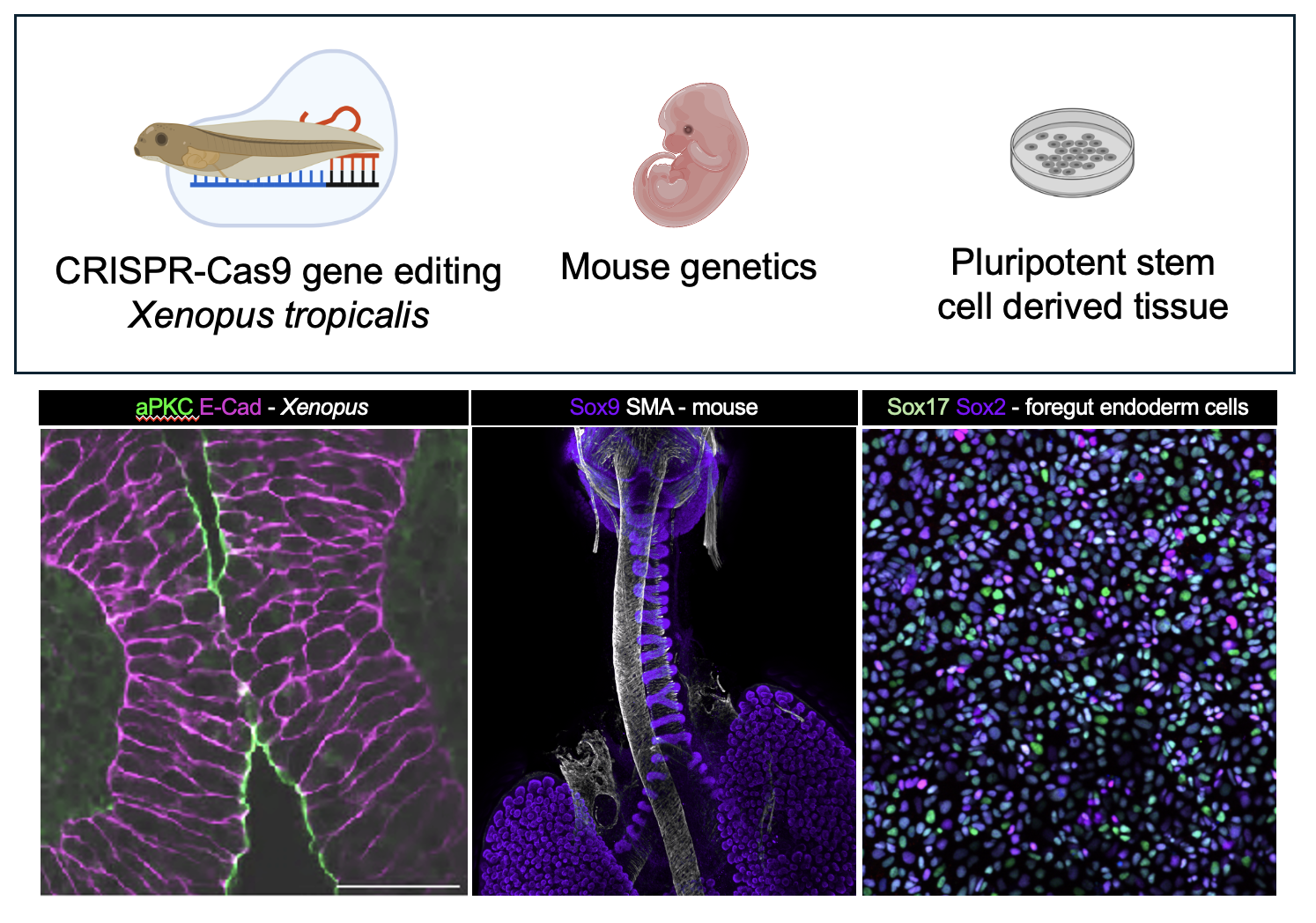 To approach this challenge, our lab uses research animal models including Xenopus (African clawed frog) and mice. Xenopus and mice have all of the same organs as humans, including a trachea and esophagus, and their organ development is similar, making them excellent models to study human development and disease.
